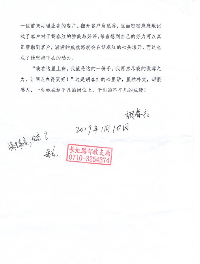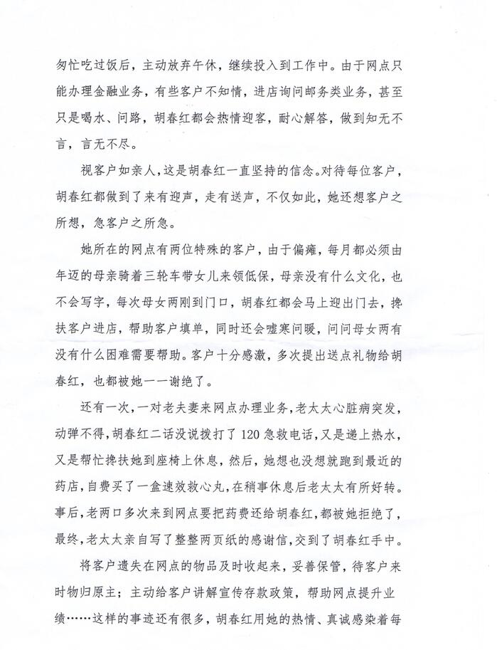還有一次,一對老夫妻來網(wǎng)點辦理業(yè)務(wù),老大大心臟病突發(fā),動彈不得,胡春紅二話沒說撥打了120急救電話,又是遞上熱水又是幫忙攙扶她到座椅上休息,然后,她想也沒想就跑到最近的藥店,自費買了一盒速效救心丸,在稍事休息后老太大有所好轉(zhuǎn)事后,老兩口多次來到網(wǎng)點要把藥費還給胡春紅,都被她拒絕了,最終,老大大親自寫了整整兩頁紙的感謝信,交到了胡春紅手中。將客戶遺失在網(wǎng)點的物品及時收起來,妥善保管,待客戶來時物歸原主;主動給客戶講解宣傳存款政策,幫助網(wǎng)點提升業(yè)績……這樣的事跡還有很多,胡春紅用她的熱情、真誠感染著每一位前來辦理業(yè)務(wù)的客戶。翻開客戶意見薄,里面密密麻麻地記載了客戶對于胡春紅的贊美與好評,每當(dāng)想到自已的努力可以真正幫助到客戶,滿滿的成就感就會在胡春紅的心頭漾開,而這也成了她堅持下去的動力。“我在這里上班,我就是這的一份子,我愿意盡我的微薄之力,讓網(wǎng)點辦得更好!”這是胡春紅的心里話,雖然樸實,卻很感人,一如她在這平凡的崗位上,干出的不平凡的成績!